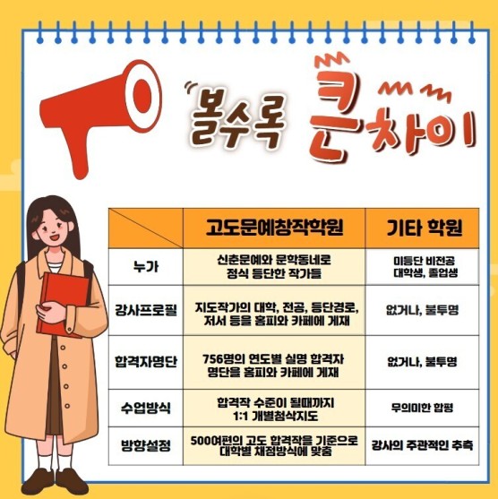 – 고도문예창작원은 2006년 한국에서 처음 개원한 문창과 입시전문학원입니다.